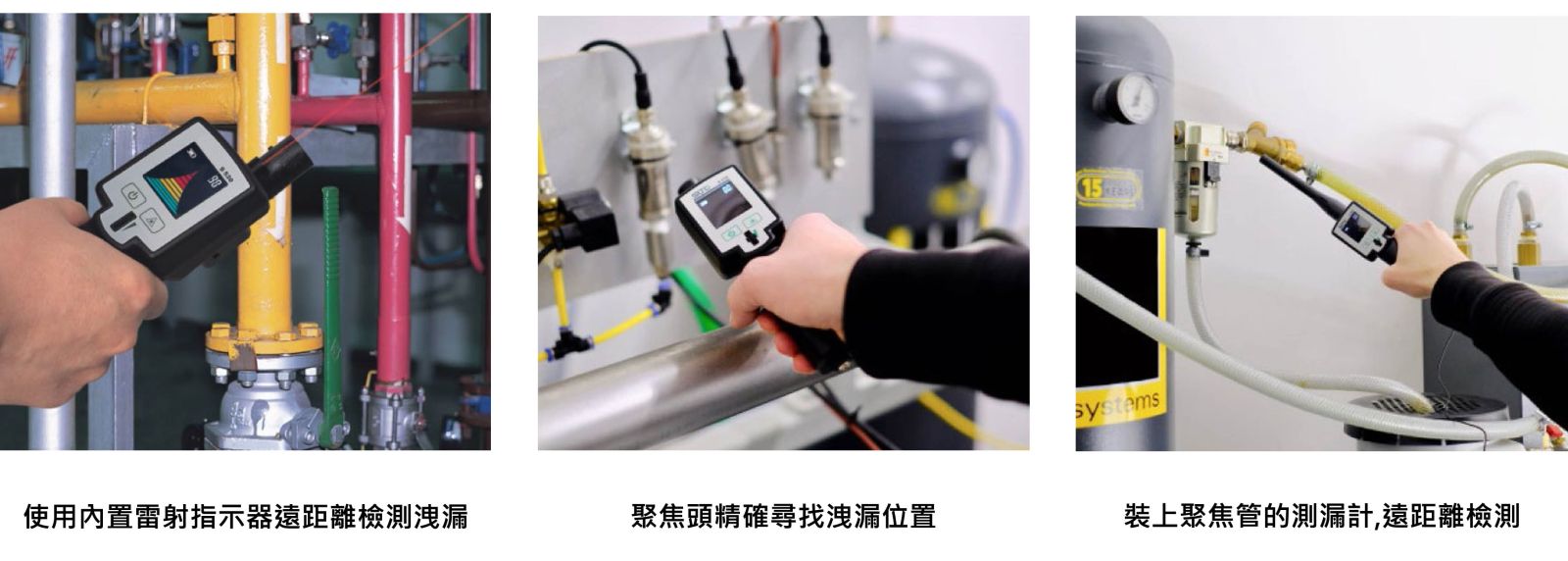 射光將指向數米外洩漏的具體位置。在非加壓的狀態下,可使用超音波音源產生器,極小孔的細微洩漏也可檢測到。